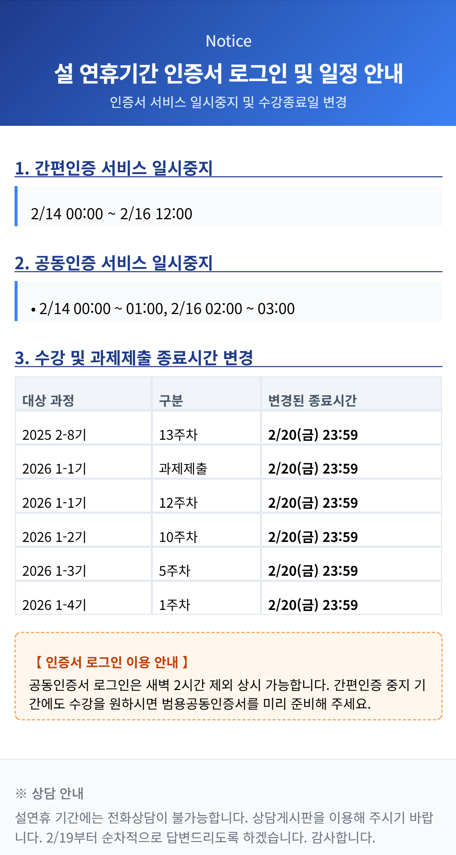 제목 설연휴 인증서 서비스 중지시간 및 수강종료일 변경 안내